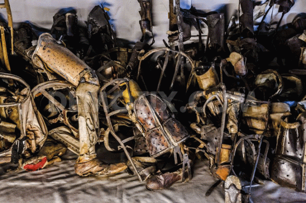 Photo description: colour photograph of adaptive mobility devises taken from prisoners with disability on arrival at Auschwitz. |