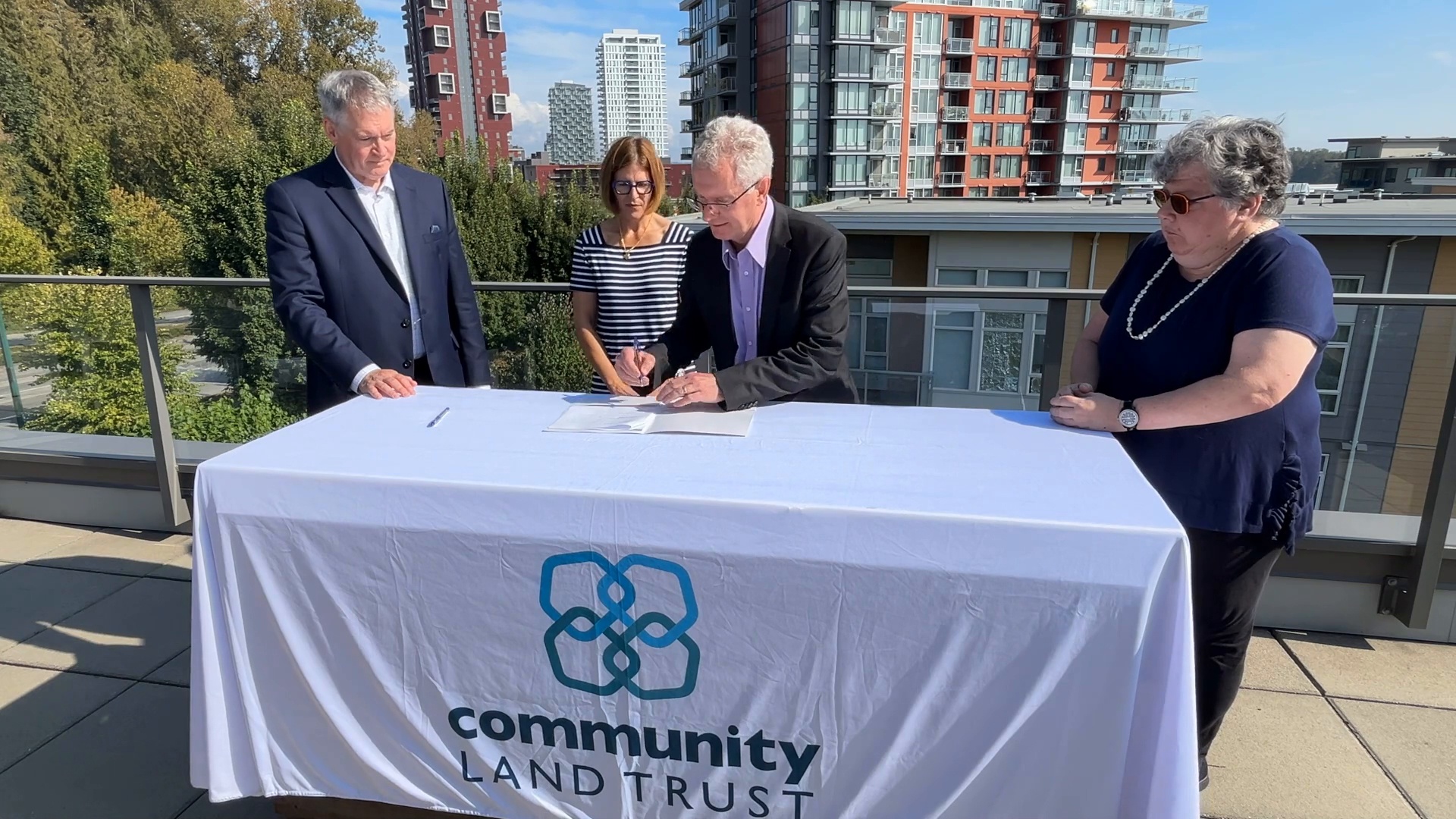 Thom Armstrong, CEO, Co-operative Housing Federation of BC, Tiffany Duzita, Executive Director, Community Land Trust, Ross Chilton, CEO, Community Living BC, and Cheryl Fryfield, Co-op resident announce the joint agreement, overlooking the Sawmill Housing Co-op (building on the left of the picture).